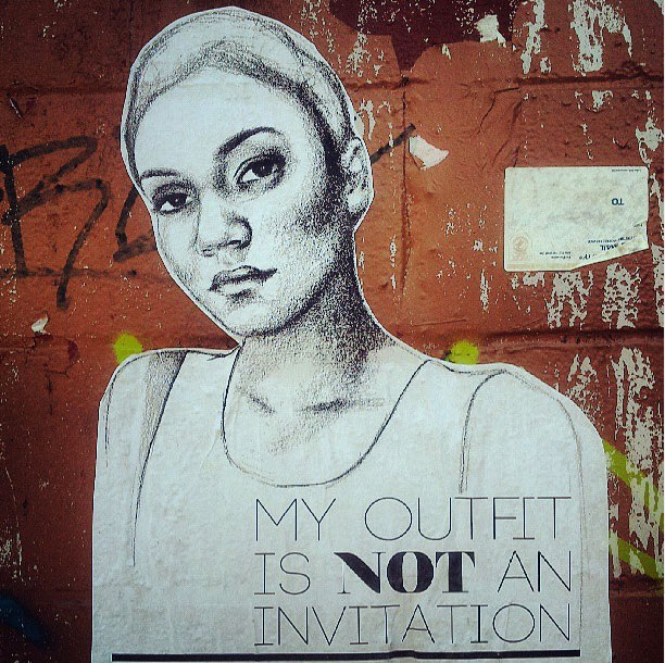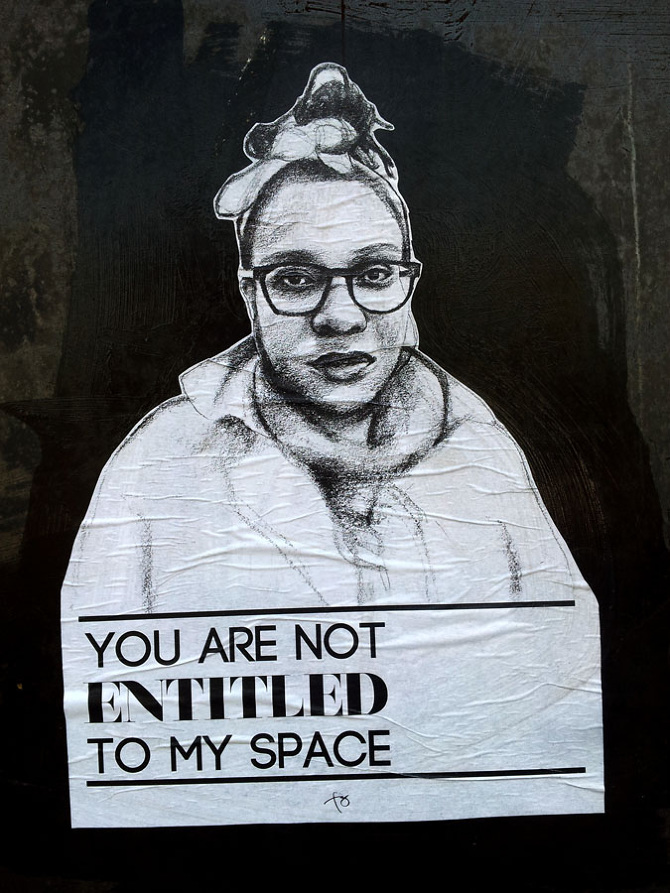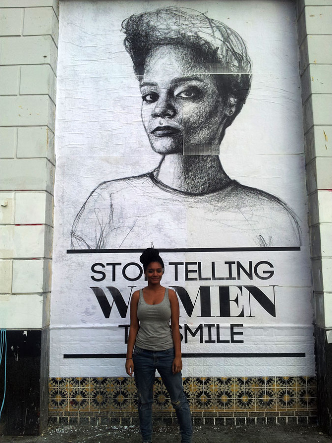 Tatyana Fazlalizadeh kommt aus den USA und ist eine Malerin, Street-Artkünstlerin und Illustratorin. In ihrer Arbeit konzentriert sie sich auf klassische Portraitmalerei, die sie mit politischen und sozialen Themen verbindet. 2012 startete sie das Projekt „Stop Telling Women To Smile“, mit dem sie sexuelle Belästigung von Frauen* auf der Straße thematisiert. Dabei sind auch Sätze wie „My Name is not Baby“, „My outfit is not an inivitation“ oder „Women are not outside for your enertainment“ enthalten.